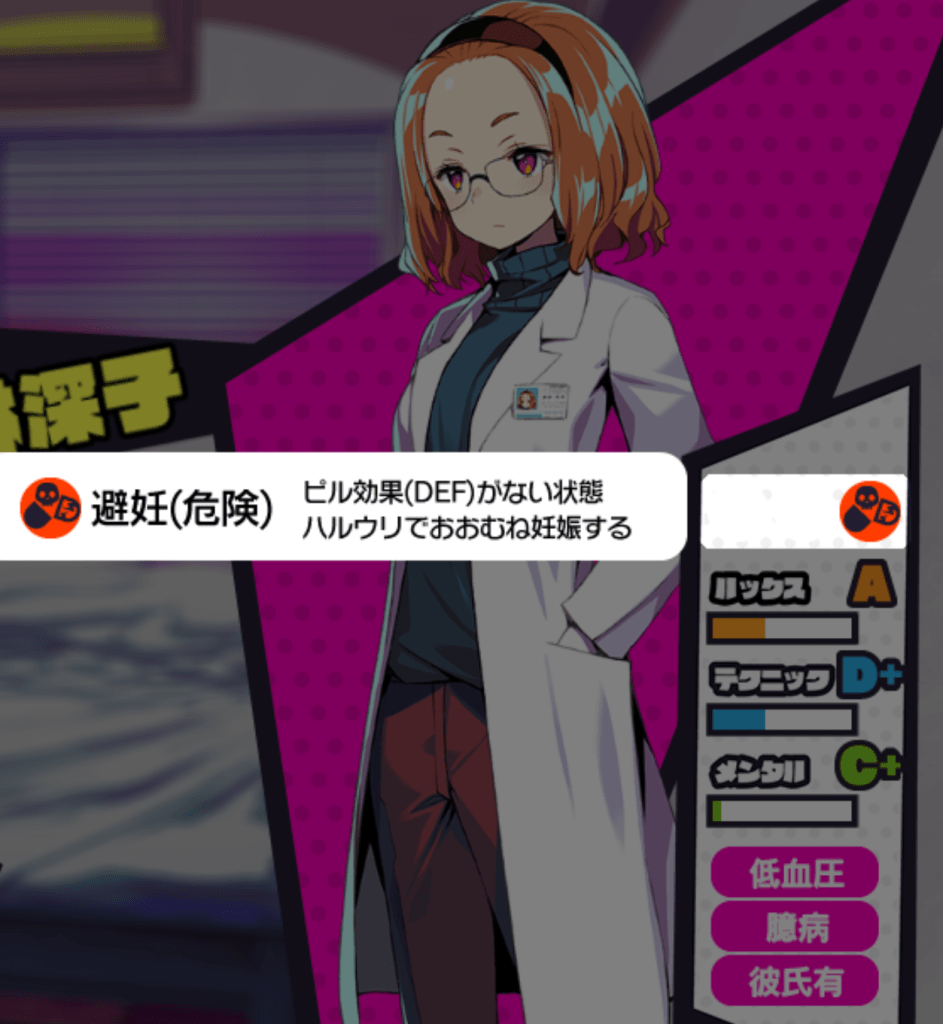 进入正式的经营、战斗阶段。首先看看之前抓来的公司妹子。我的妈,这恐怖的负面属性,而且没有避妊,来一次就会有。有了之后接待的话消耗增加,而唯独初始颜值很高,可以强行抢一下人。(但是技术不佳,也赚不到太多钱)简直把{消耗品}写在脸上,可能是游戏教你有的妹子就是需要用了扔的。真是残忍啊……