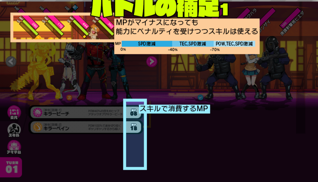 战斗中动作会消耗mp,mp消耗完之后也可强行释放动作,但是威力降低。越是负mp惩罚越大。