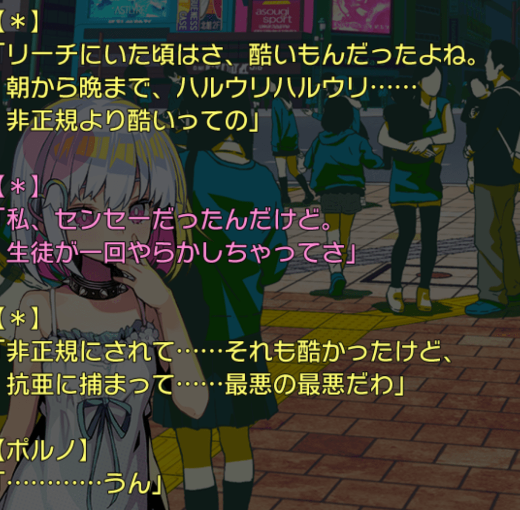 女人『是的。就算在这种城市混,人生也是没什么希望的吧?所以我们姐妹一起努力打算从头开始,你想想,你在那种地方一直卖的话,到头来也只是个【非正规】而已吧?不觉得很糟吗,所以说,要不要一起来呢』