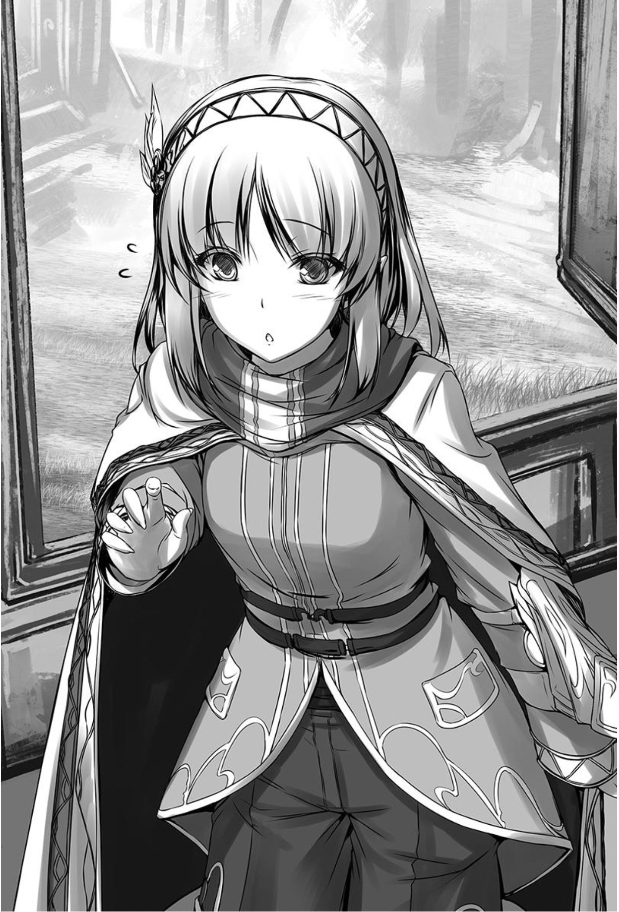 她披着一件精致的旅行斗篷。头上戴着美丽的发箍,银白色的羽毛发饰点缀着少女明亮而精致的。
