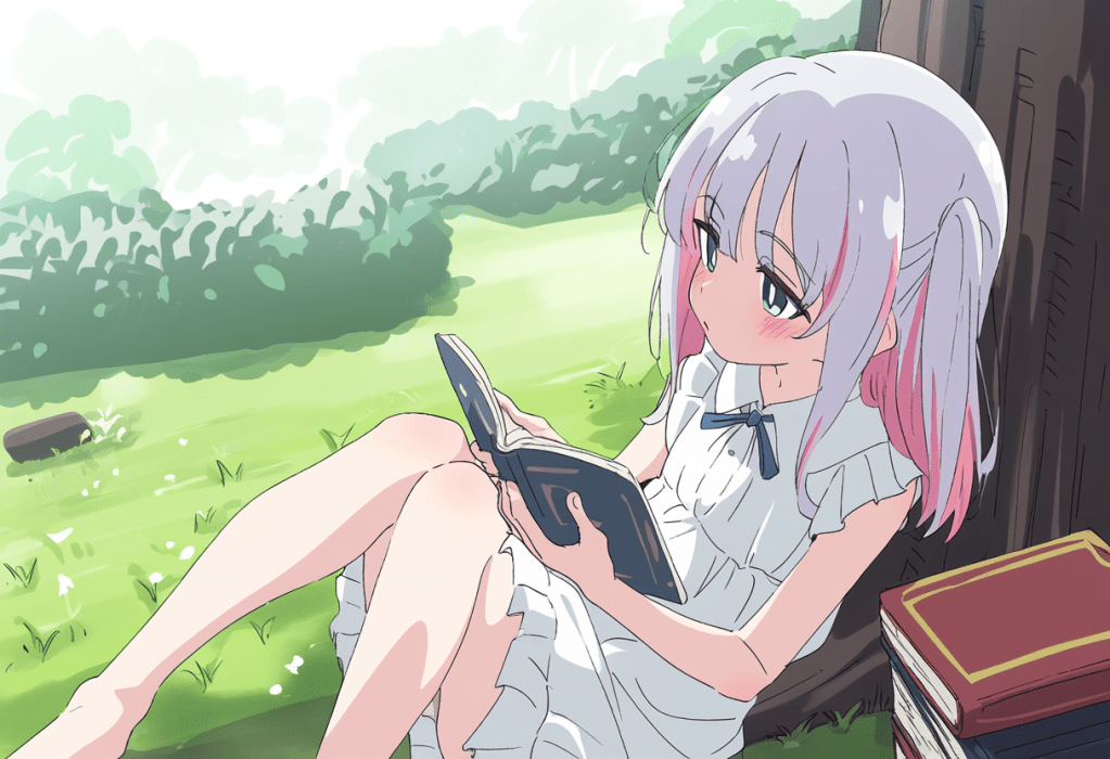 城堡前草地,一颗大树下,一位龙族的少女正坐在地上翻看着摊开的人类书籍。