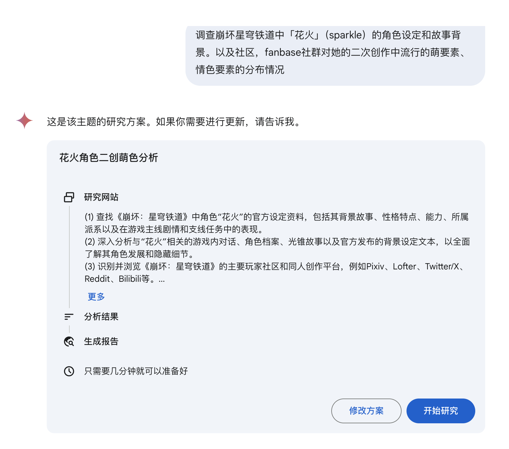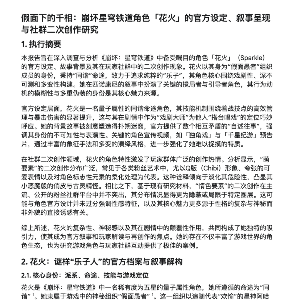 几分钟后,我得到了一个花火的角色设定、萌点和二创倾向的分析报告。