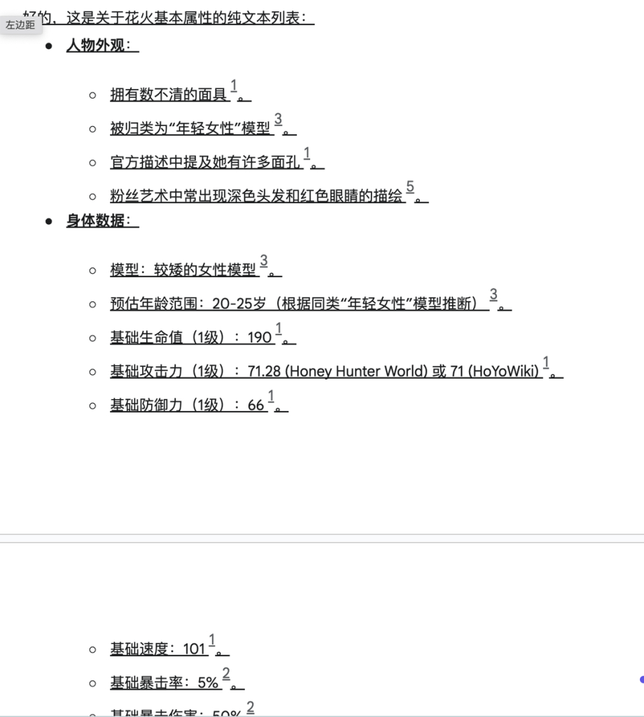 接下来,我再让AI做一件简单的事:将资料中花火的人物数据,比如身材、三围、技能等等基础数据做一个总结。