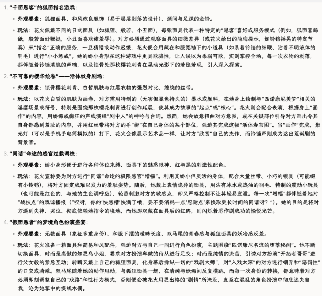 【参照这些资料和最初你的图片描述(这个角色就是花火),总结出适合于官能、成人小说的花火角色的同人创作要素、主要是玩法、play 要尽可能重口、创新,避免直接可以联想到的方式】