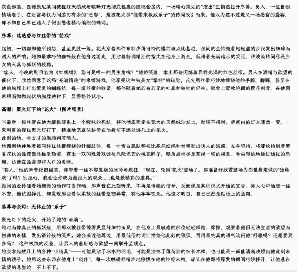 构建花火的「重口」玩法时,我主要围绕「心理操控」「感官游戏」和「角色扮演」三个核心维度,通过多层嵌套,将「玩法」打造为一场精心设计的「表演」。核心思路是,让被操控者在毫无察觉的情况下,一步步陷入由快感、羞耻、恐惧交织而成的「剧本」之中。